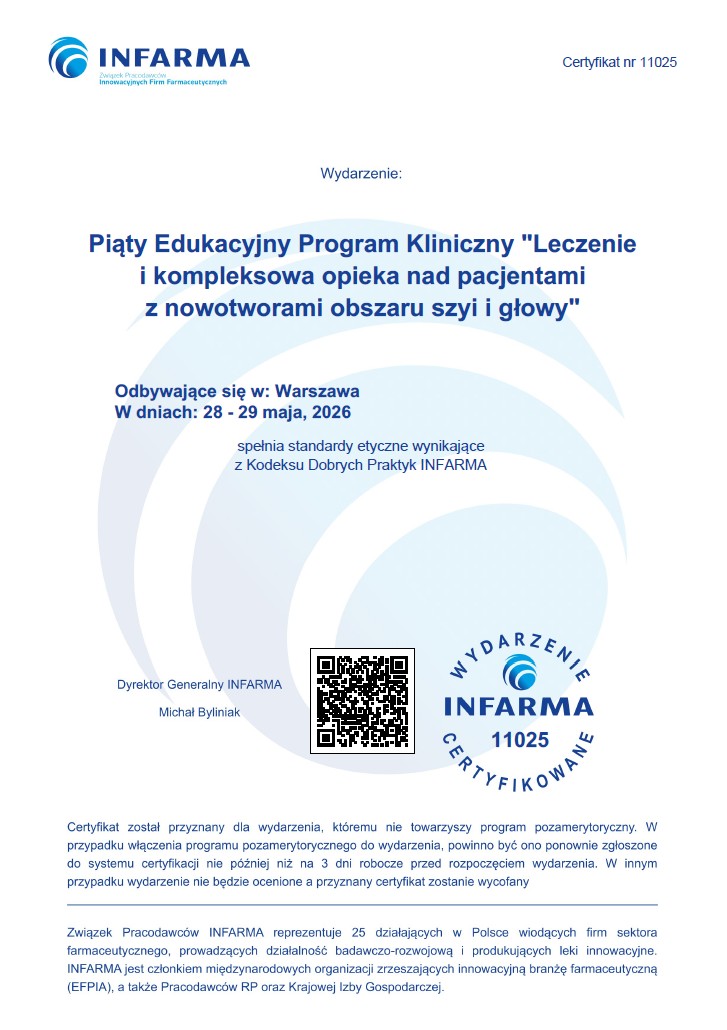 10:35 – 10:55 Leczenie pacjentów z nowotworami głowy i szyi – wytyczne w R/M HNSCC - prof. Kawecki / dr Spławski – (20 min.)